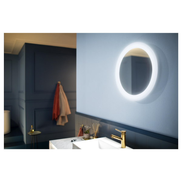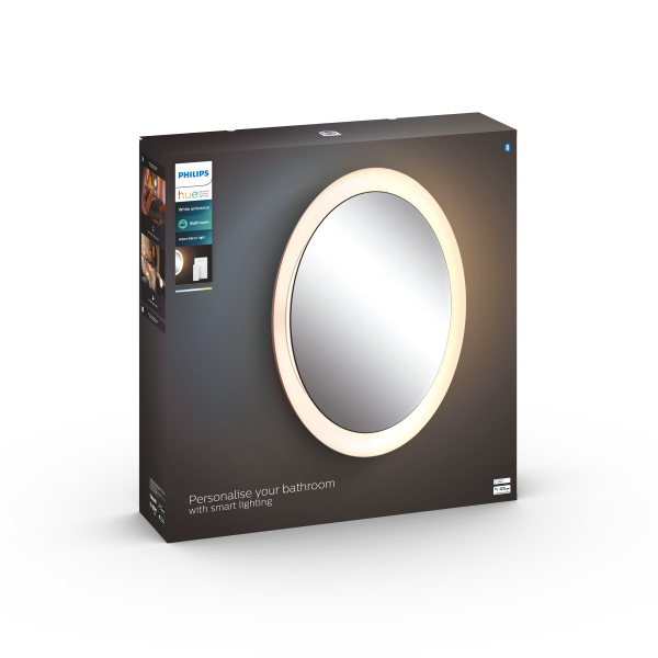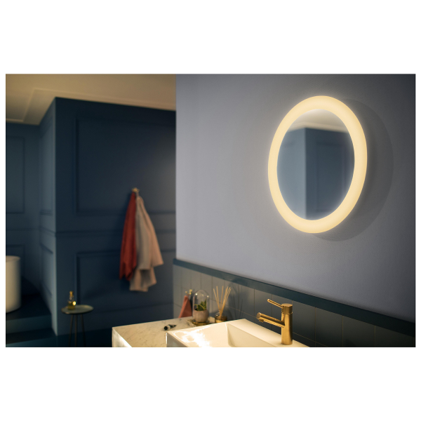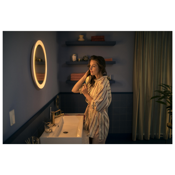 A stylish mirror whose edges are surrounded by light with adjustable color temperature. The light can be controlled with the supplied dimmer switch or with the Philips Hue app. Declared luminous flux 2550 lm, color temperature 2200 - 6500K. Protection class IP44.