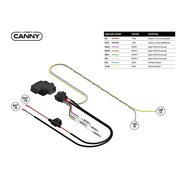 A canbus relay which picks up the excitation from the canbus for four inputs, such as auxiliary light, parking light, reversing light, etc. The system consists of a Canny Dongle, a wiring harness and a mobile app.