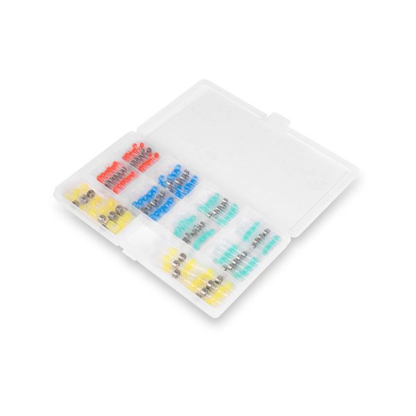 Heat shrinkable connector assortment with 120 moisture-resistant connectors with tinned and adhesive heat shrink sleeves for wiring additional and work lights, for example. Contains 40 connectors suitable for 0.5-1 mm², 40 connectors suitable for 0.75-1.5 mm², 20 connectors suitable for 1.5-2.5 mm² and 20 connectors suitable for 4-6 mm² wires. The connector is heated over the joint.