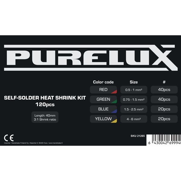 Purelux Self-Solder Heat Shrink Kit is a handy heat shrink connector set that contains a total of 120 moisture-resistant connectors for connecting wiring for, for example, auxiliary and work lights. The connectors have an adhesive heat-shrink sleeve that is heated over the joint, which also melts the tin in the middle of the connector and forms a really strong joint. The joint becomes both tensile and moisture-resistant, making the connector optimal for vehicle use. In practice, the two wires to be connected are fed in from the ends of the connector, after which the heat-shrink sleeve and the tin in the middle are heated and the wires are locked in place. When the heat-shrink sleeve is heated, the adhesive in it is activated and forms a moisture-resistant joint.