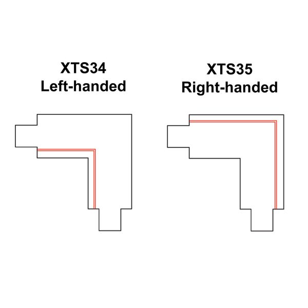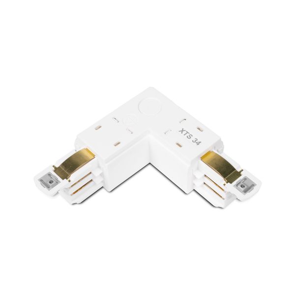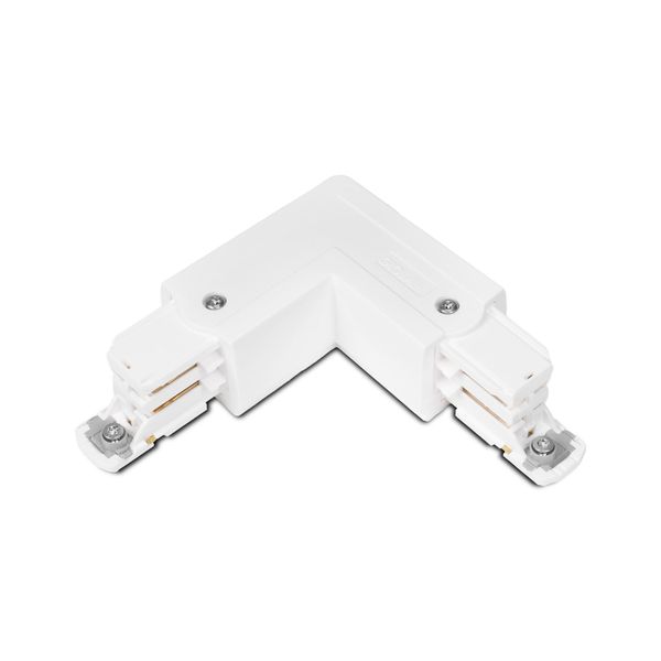 Combined corner connector and input box for Global Trac Pro 3-phase light track. The connector allows both power supply and the creation of a 90° angle in the track. With a left-handed connector, the power supply comes from the inside edge of the connector and with a right-handed connector it comes from the outside edge. Available in both black and white.