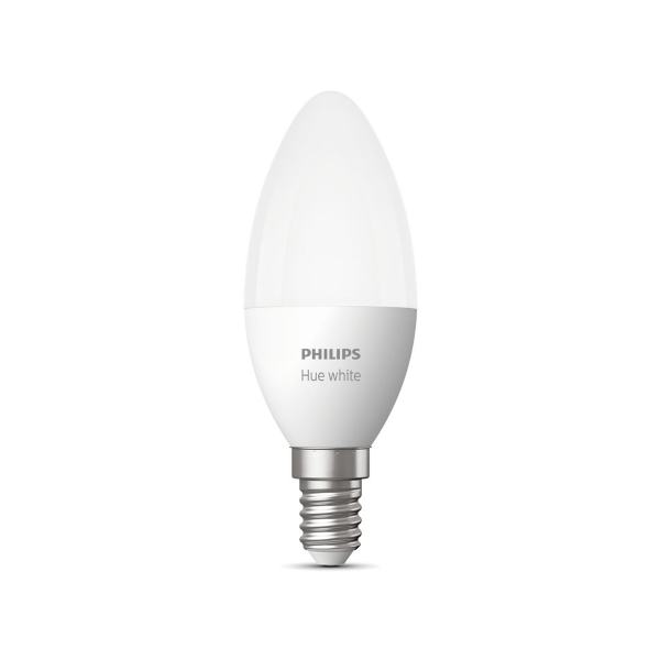 Dimmable Philips Hue smart LED lamp with E14 socket, adjustable via mobile phone and Philips Hue Bridge. Specified luminous flux 470 lm, color temperature 2700 K.