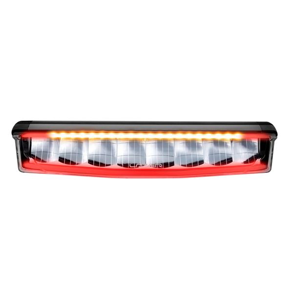 The Lazer AIR-55 is a small but powerful auxiliary light with a modern design, featuring an R65XA1-approved orange warning light, a traditional road-legal white light, an eye-catching red position light, and two power modes. Despite its size, the high-performance AIR-55 Beacon offers a light output of 6800 lumens and a beam reaching up to 524 meters @ 1 lux in the E-Boost mode intended for off-road use, according to the manufacturer. The panel's highly reflective vacuum-metallized reflector surfaces combined with high-performance LEDs create a pleasant combination beam pattern that illuminates both far ahead and wide to the sides of the road. The beam, optimized for heavy machinery, opens perfectly even when mounted high, and thanks to the separate beacon function, this auxiliary light bar is the perfect solution for all vehicles driving on highways, construction sites, and off-road.
