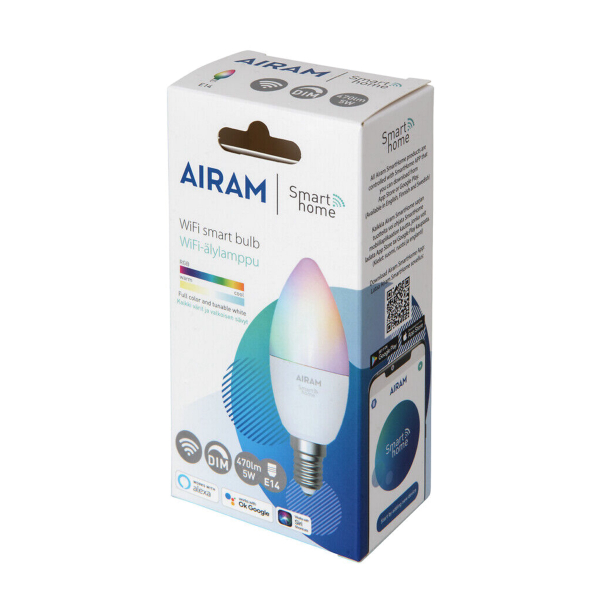 Multicolor LED lamp with E14 socket that can be controlled via the Airam SmartHome app. Adjustable color temperature (2700K - 6500K), fully dimmable. Three year warranty!