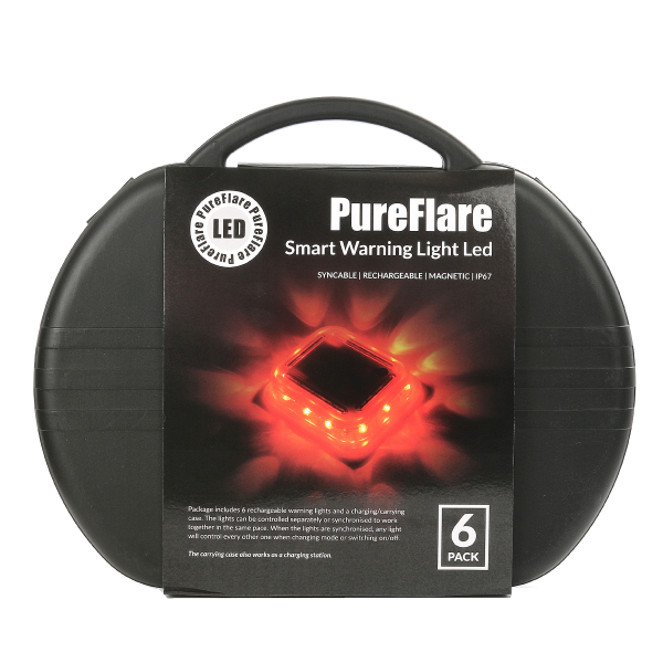 The Pureflare Smart Warning Light is a complete kit with six high-quality rechargeable light pucks. The pucks are automatically synchronized when they are connected to each other, so through one puck you can control the effect mode and switch the other pucks on/off. The pucks are delivered in a hardcase bag, which works great for both transporting and storing the pucks . The bag also charges all pucks at the same time. The kit contains both a mains adapter and a 12V cigarette adapter. The bag is designed to be able to load the pucks even with the lid closed.