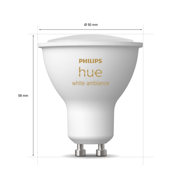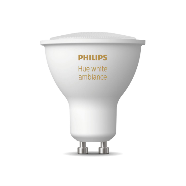 Philips Hue White Ambience GU10 is a smart LED lamp with an adjustable color temperature of 2200 - 6500 K, perfect as general and mood lighting in the home! The lamp's various functions such as color temperature or dimming can be adjusted steplessly via the Philips Hue app. With the help of the smart LED lamp, practically any lamp with a GU10 socket can be made compatible with Philips Hue smart systems. In this way, the home's various smart lighting solutions can also be implemented with the lamps that are already in the rooms. The lamp can be controlled either directly with a smartphone via Bluetooth, or it can be connected to the Hue Bridge, in which case the lamp can be controlled with other Hue lamps via the Bridge. Philips Hue lamps work seamlessly with all smart accessories in the Philips Hue series, such as the Hue Dimmer Switch, of course the lamp can also be turned on and off with a regular switch. Declared luminous flux 400 lumens, color temperature 2200 - 6500 Kelvin.