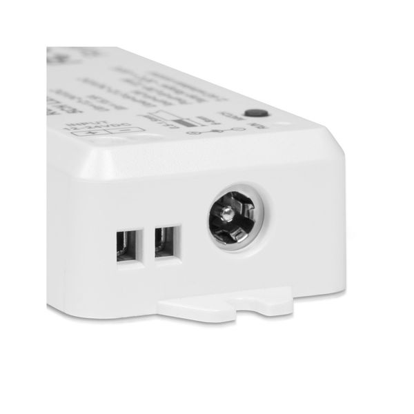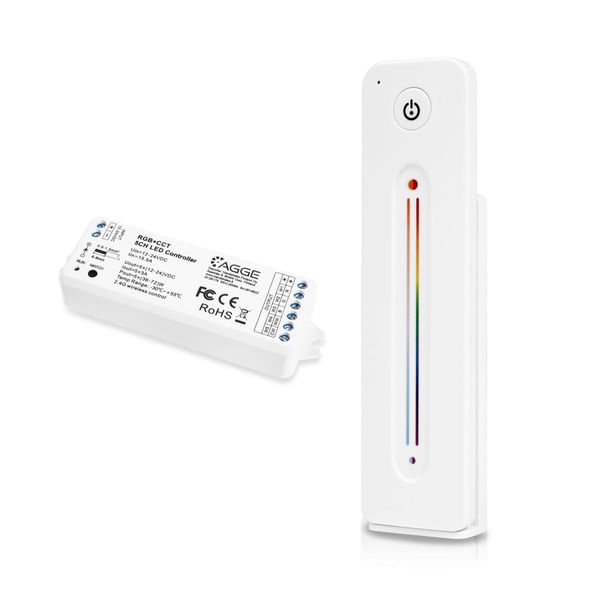 A control unit for RGB+CCT light strips, which allows you to adjust the brightness, color temperature and light color of the LED strip with a separate remote control. Works with 2.4 GHz radio frequency. Intended for dry indoor use (IP20), max. load capacity 15A.