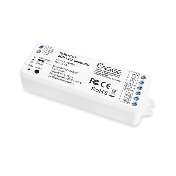 AGGE RGB+CCT Color Controller is a control unit for LED strips with adjustable color temperature and RGB colors, which enables completely stepless brightness, color temperature and light color adjustment of the strip, as well as remote control with a remote control. The controller is installed between the strip and the transformer/power supply so that the transformer is connected to the ready-made connector (or INPUT connectors) of the control unit and the wires of the strip are connected to the OUTPUT connectors of the control unit. After this, the control unit receives commands from the remote control to change the light output, color temperature or color of the strip and adjust the lighting. The control unit operates at a 2.4 GHz radio frequency and can be connected to any remote control operating at the same frequency. In an unobstructed area, the controller has a detection range of 30 meters. The control unit has built-in protection mechanisms against overheating, overload, short circuits and reverse polarization. Intended for dry indoor use (IP20). Two-year (24 months) warranty!