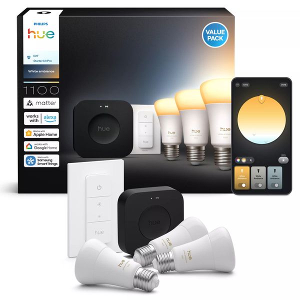 A starter kit to create the foundation for smart lighting in your home. The set includes 3 Philips Hue smart bulbs with E27 sockets with adjustable color temperature, a switch, and the AI-powered Hue Bridge Pro, which allows you to control and adjust all your Hue bulbs and lights from one place!