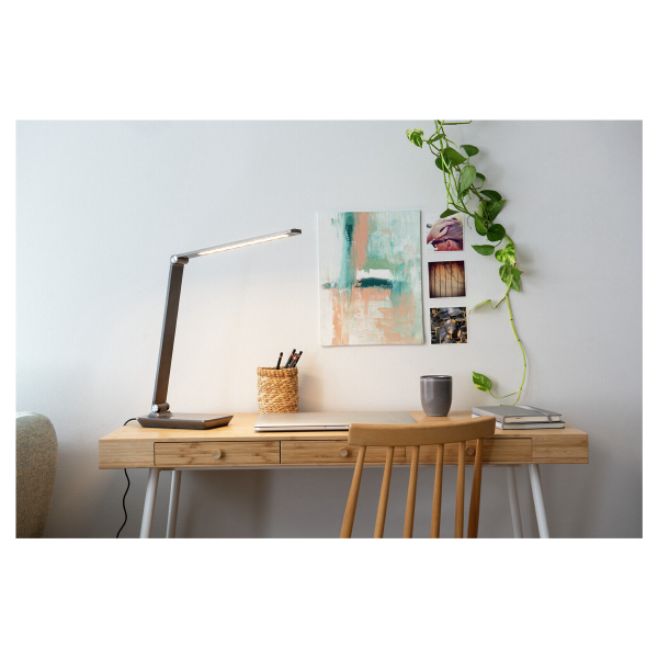 In addition to its touch buttons, the lamp base is equipped with a wireless charging option for, for example, a mobile phone and a USB output. The lamp has a high-quality color reproduction and a large number of LEDs that provide a very good light that facilitates office work. The manufacturer states a luminous flux of 575 lumens.