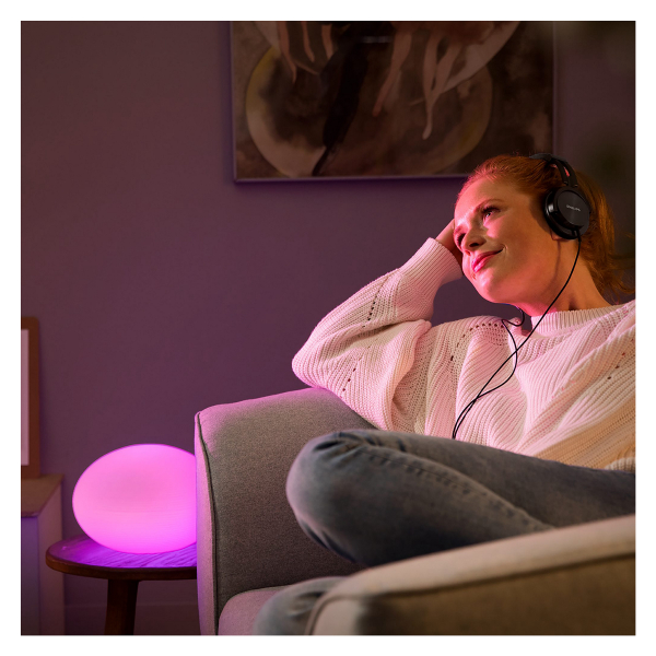 Table lamp equipped with a Philips Hue smart LED lamp with E27 socket. Controlled via the phone or Hue Bridge. Declared luminous flux 800 lm, color temperature 2000 - 6500K. Protection class IP20.