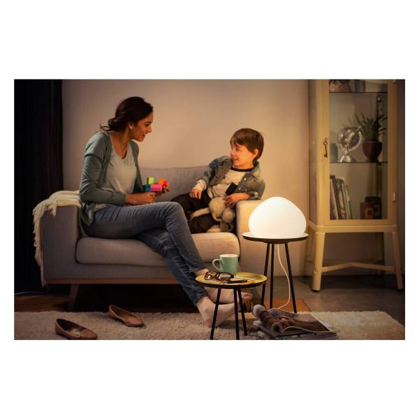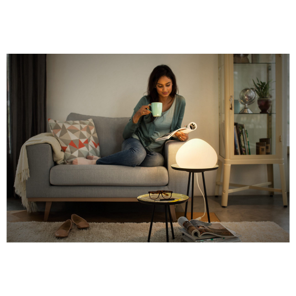Footless modern table lamp with Philips Hue smart LED lamp with E27 socket. Controlled with the phone, Hue Bridge or included dimmer. Declared luminous flux 800 lm, color temperature 2200 - 6500 K. Protection class IP20.