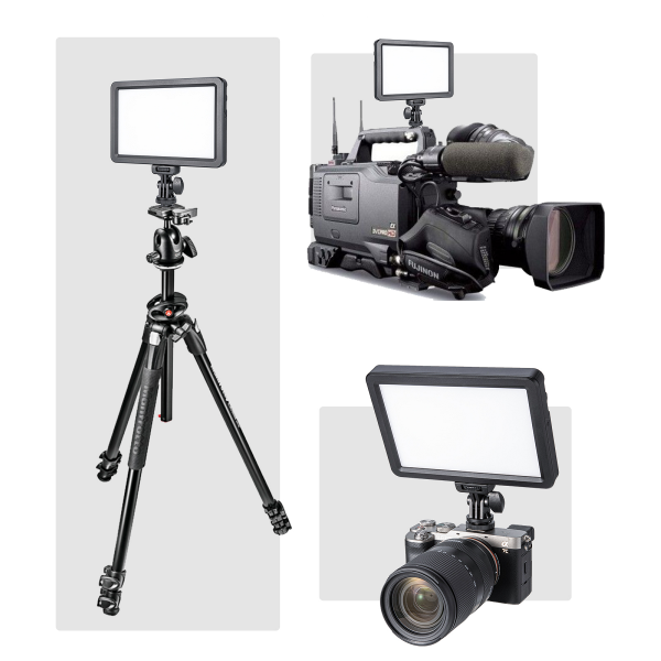 The lamp can be attached directly to a camera or tripod with a 1/4" thread or with the supplied adapter which has both a 1/4" thread and a camera mount (Cold Shoe). The included adapter allows you to raise and lower the lamp to the desired height, and this is complemented by the fact that the photo lamp can be rotated 360° around the adapter, which allows the light to be directed to the desired location. Of course, the lamp can be placed without a bracket, e.g. on a table or other flat surface, this makes your possibilities endless.