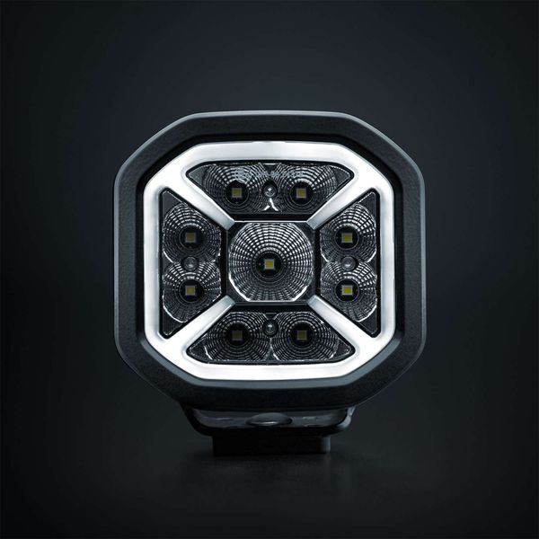 Compact and durable work light with a unique design and striking details that give your vehicle or work machine an eye-catching overall look. Features include a wide beam, bright 5700K color temperature, and orange or white parking lights. Suitable for demanding use. Rated light output 5650 lm, range 102 m @ 1 lux.. IP68/69K rating.